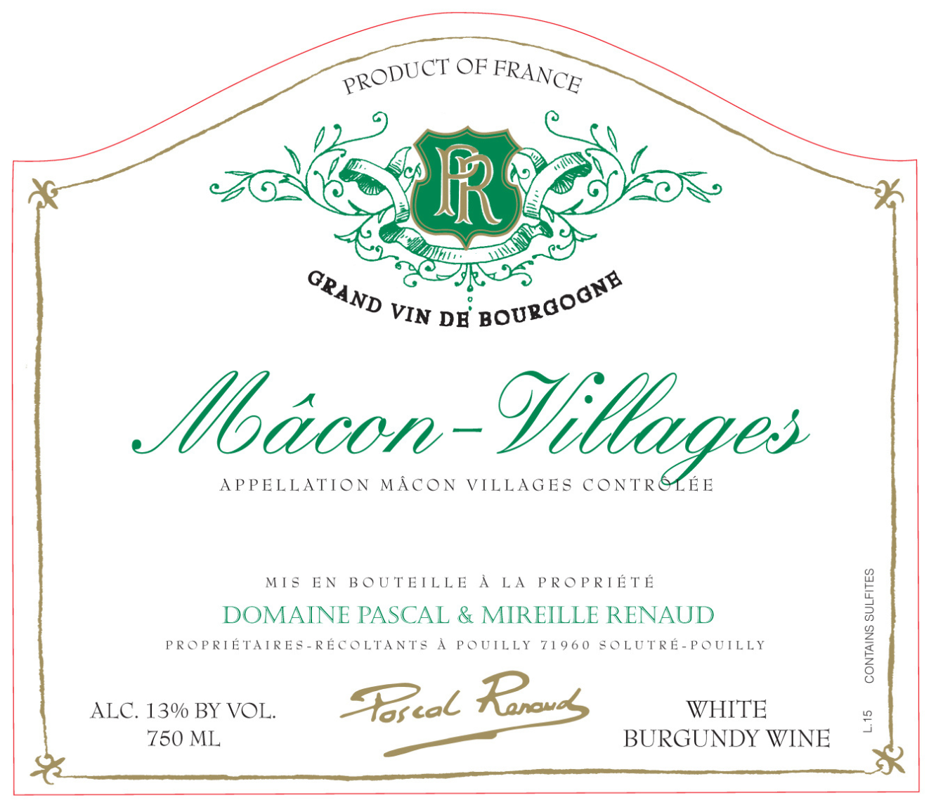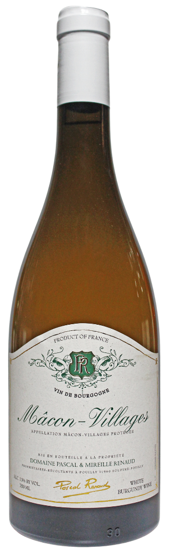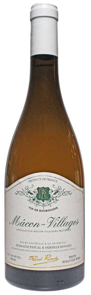 Mâcon Villages Domaine Renaud domainepascalrenaud.com Vintage 2024 Region Burgundy Appellation Mâcon Villages Vine Age 30 Years Varietals 100% Chardonnay Soil Type Limestone Sizes Available 750 mL Closure Cork Food Pairing As an apéritif, with salads, or with seafood. Press 92 Points, Wine Enthusiast (2023)90 Points, Wine Spectator (2023) Vinification Manual grape-picking.Immediately pressed. Cooling after pressing. Wine maturation in stainless steel, to preserve the fruit. Tasting Notes Ripe fruit with mineral overtones. A crisp clean and ripe finish. POS Shelf TalkerShelf talker Fact Sheet Fact Sheet Bottle ShotBottle Shot LabelLabel Other Wines by this Estate Mâcon Villages Read more Pouilly-Fuissé “Cuvée Vieilles Vignes” Read more Pouilly-Fuissé 1er Cru “Aux Bouthieres” Read more Pouilly-Fuissé 1er Cru “Aux Chailloux” Read more